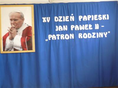 W piątek 9 października w naszej szkole obchodziliśmy XV Dzień Papieski pod hasłem "Jan Paweł II -patron rodziny". Ucznowie pod kierunkiem katechety p. B. Zająca przygotowali krótki apel o Papieżu. Na zakończenie wszyscy zaśpewali lubianą przez naszego Patrona piosenkę "Barka".