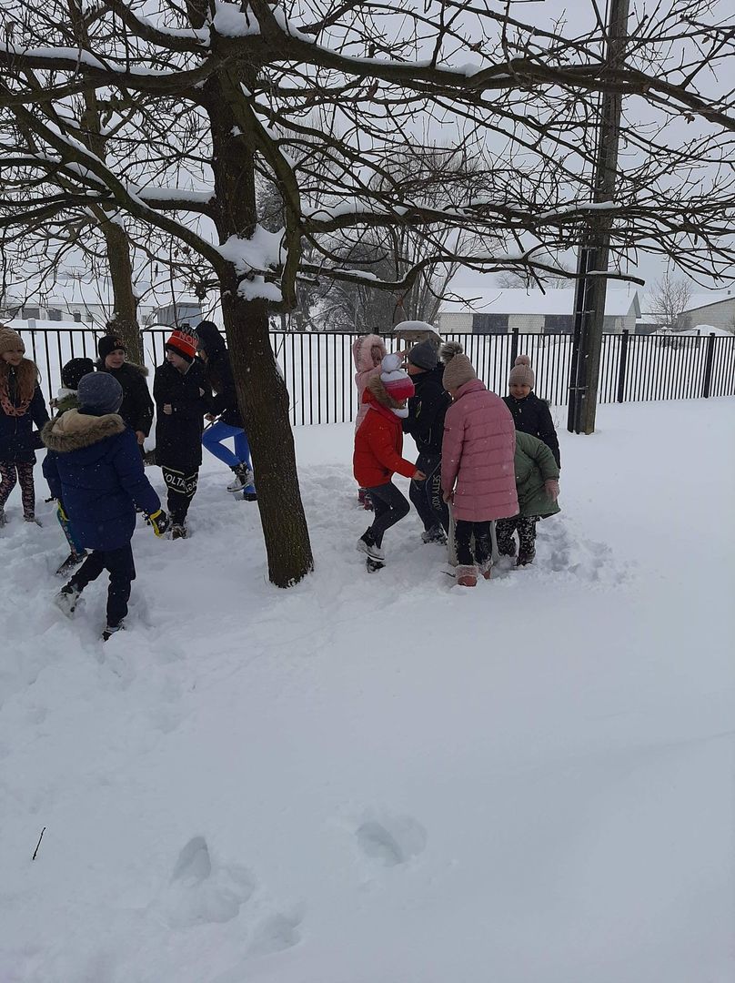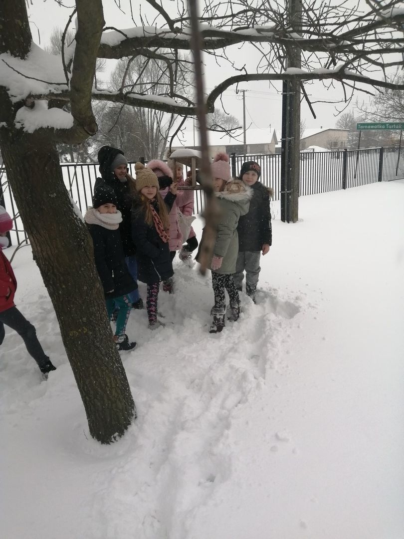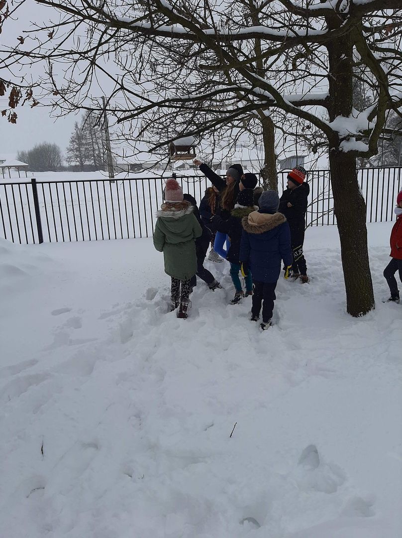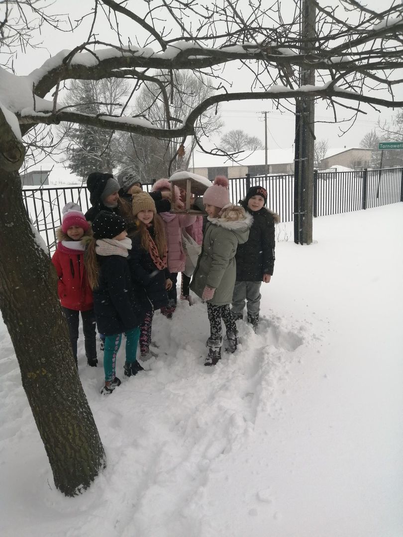 My się zimy nie boimy, bo chronią nas ciepłe ubrania i domy. W tym trudnym czasie musimy jednak pamiętać o zwierzętach domowych i dzikich. Ptaki, które są z nami potrzebują pomocy, bo śnieg przysypał im pożywienie. Uczniowie klas I - III pamiętają o nich dosypują ziarna zbóż do karmników koło szkoły, aby ulżyć doli ptaków.