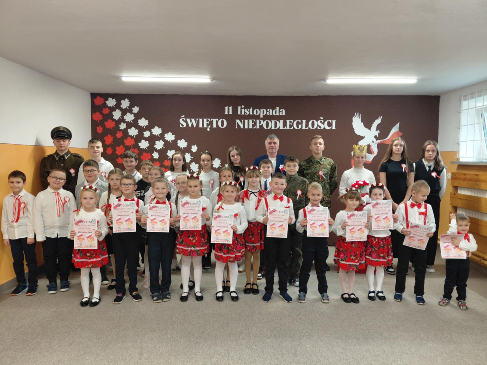 11 listopada to szczególna data w historii państwa polskiego. 11 listopada 1918 roku naród polski, który przez 123 lata był pozbawiony wolności i własnego państwa odzyskał niepodległość. Na pamiątkę tego wydarzenia 11 listopada obchodzimy Narodowe Święto Niepodległości. Z tej okazji w naszej szkole 7 listopada 2025 roku odbył się uroczysty apel patriotyczny poświęcony 107 rocznicy odzyskania przez Polskę niepodległości. Apel rozpoczął się od odśpiewania hymnu państwowego o godzinie 11:11 w ramach ogólnopolskiej akcji ,, Szkoła do hymnu”. Następnie uczniowie zaprezentowali wzruszający montaż słowno – muzyczny, w którym przypomnieli jak ważne są takie wartości jak wolność, pamięć i miłość do Ojczyzny. Zwrócili uwagę na trud i poświęcenie wielu pokoleń Polaków, dzięki którym dzisiaj żyjemy w wolnym kraju. Na zakończenie apelu wystąpiły dzieci z oddziału przedszkolnego Pszczółki. Przedszkolaki z wielkim zaangażowaniem i radością zaśpiewały oraz zatańczyły dla Ojczyzny. Nasze radosne świętowanie Dnia Niepodległości było nie tylko wyrazem wdzięczności i pamięci dla naszych przodków, ale przede wszystkim naszym świadectwem patriotyzmu. Było to także piękne święto integracji całej społeczności szkolnej.
