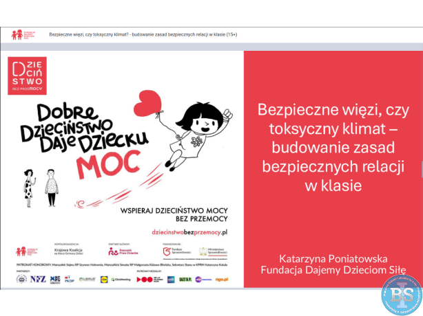 W dniu 14 listopada 2025 r. uczniowie klasy VII i VIII wzięli udział w webinarze pt. „Bezpieczne więzi, czy toksyczny klimat? – budowanie zasad bezpiecznych relacji w klasie”, przygotowanym przez Fundację Dajemy Dzieciom Siłę.