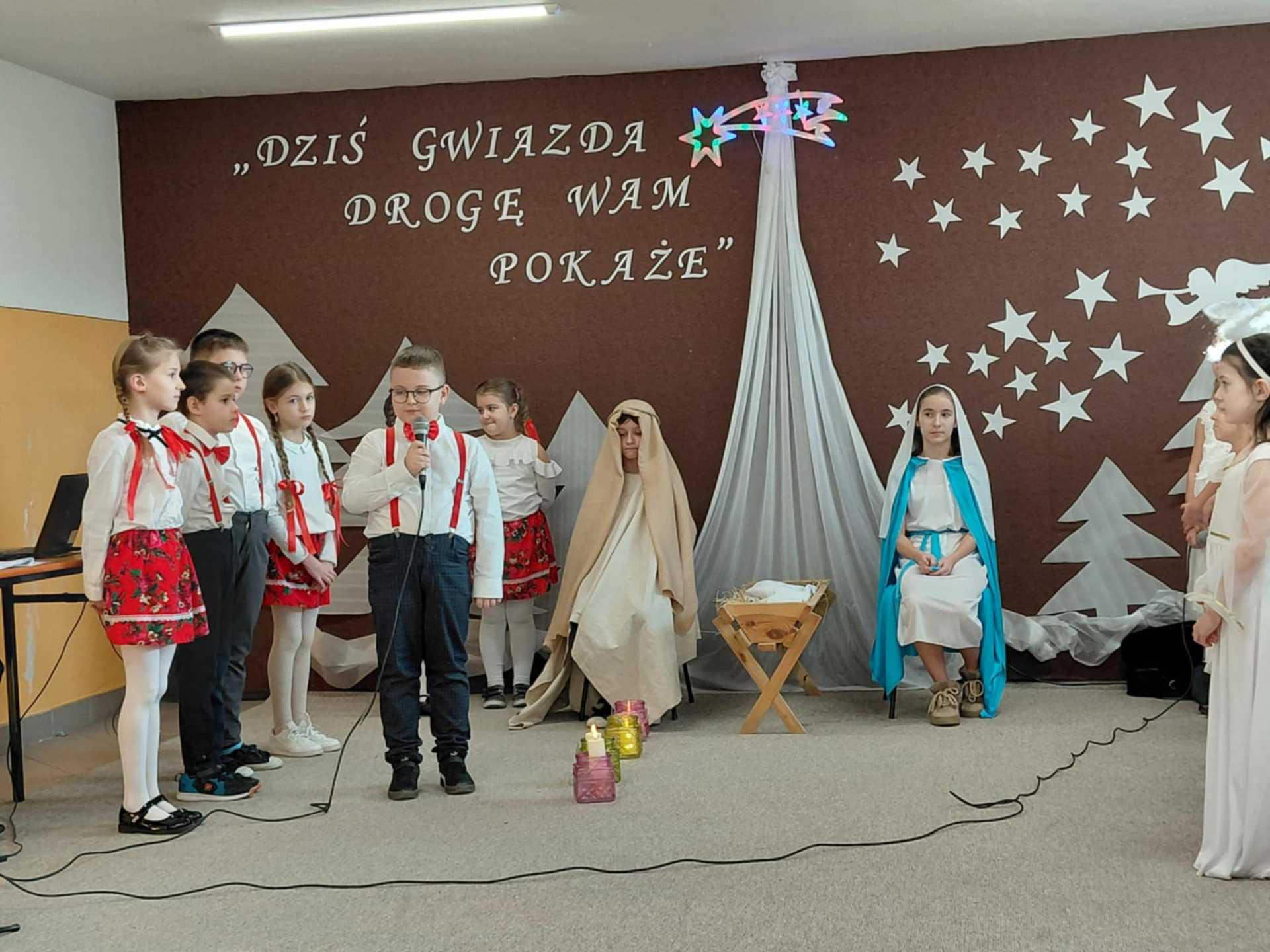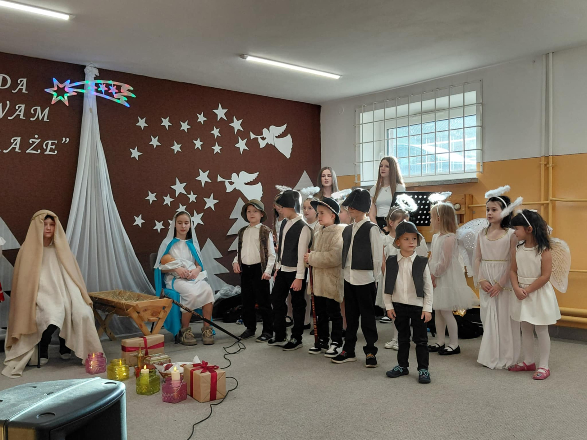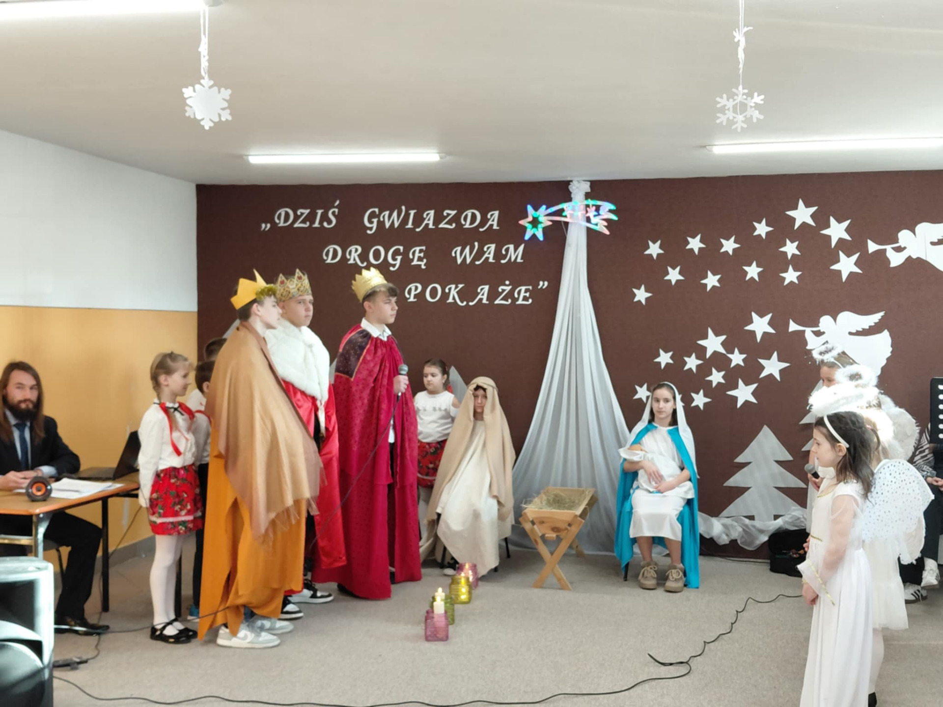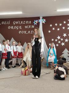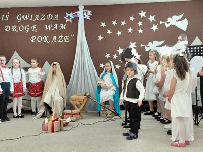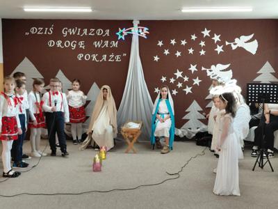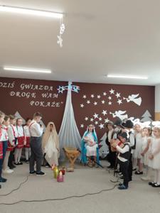 Najmłodsi uczestnicy z przedszkola zaprezentowali się w rolach aniołów i pasterzy, wzbudzając duże zainteresowanie i sympatię publiczności. Uczniowie klas II wcielili się w role dzieci wędrujących do żłóbka Jezusa, prezentując przygotowane dialogi oraz kolędy. Uczniowie klas VII i VIII pełnili funkcję narratorów oraz aktorów, dbając o spójność przekazu i właściwy przebieg przedstawienia.