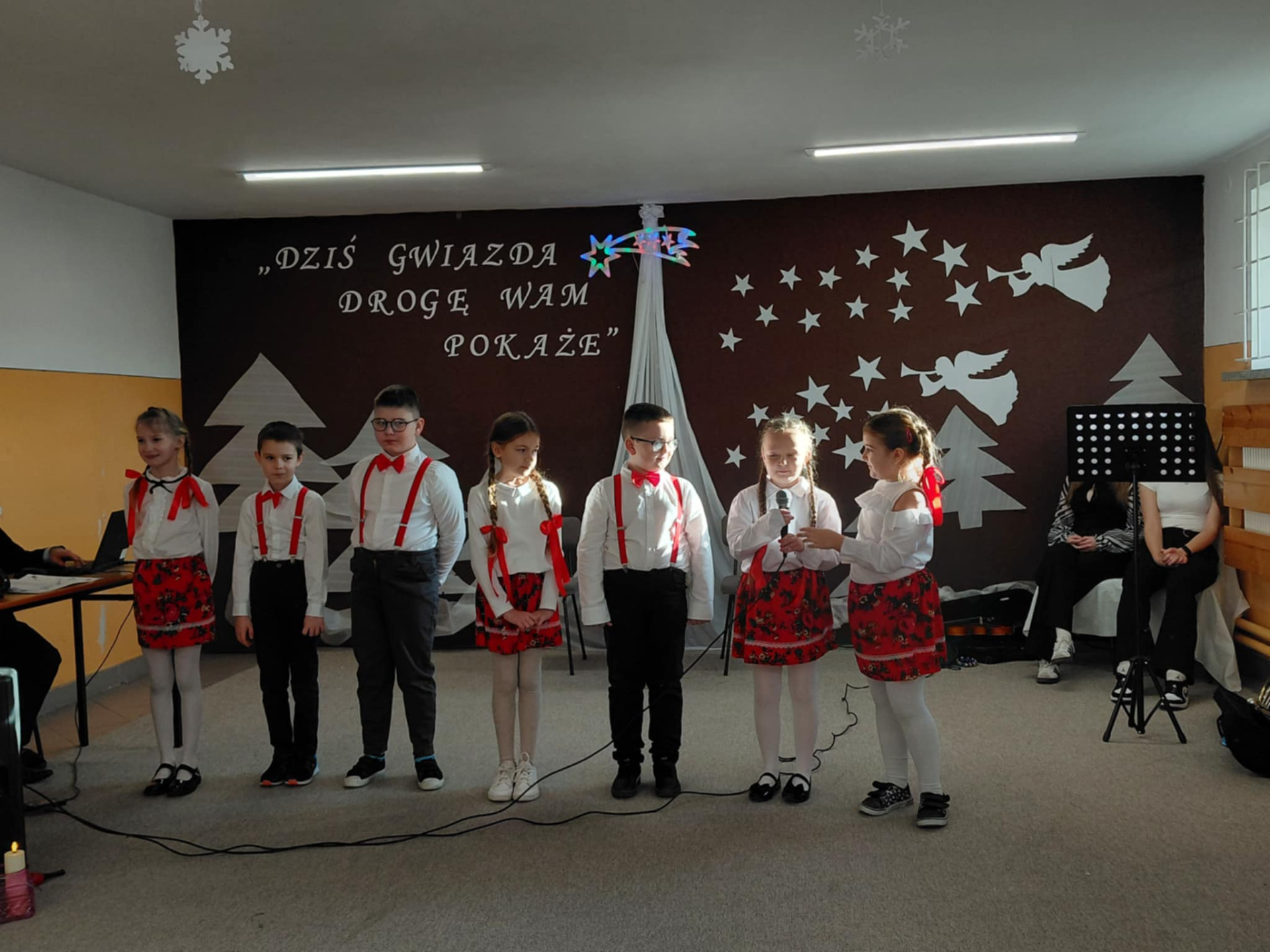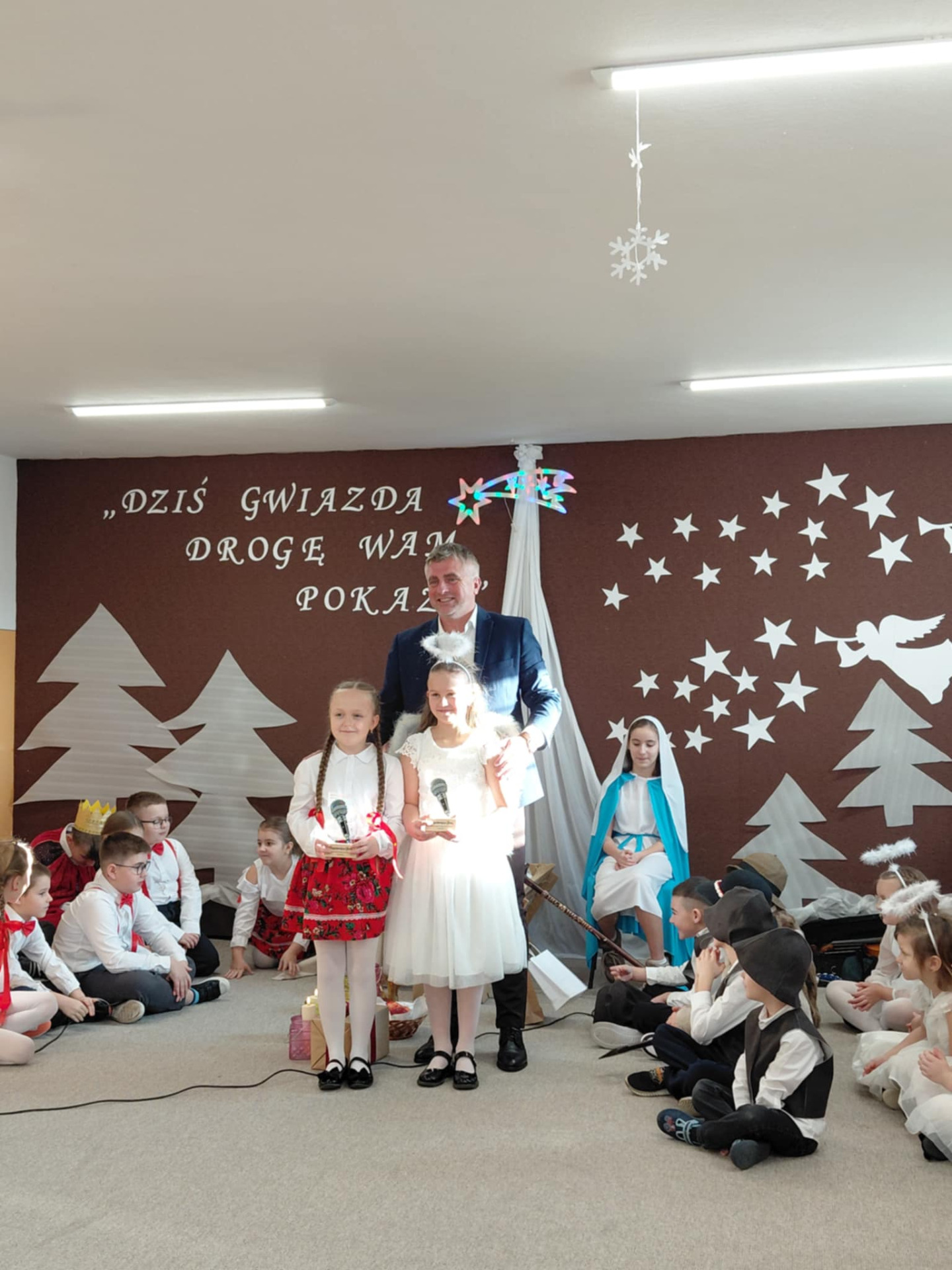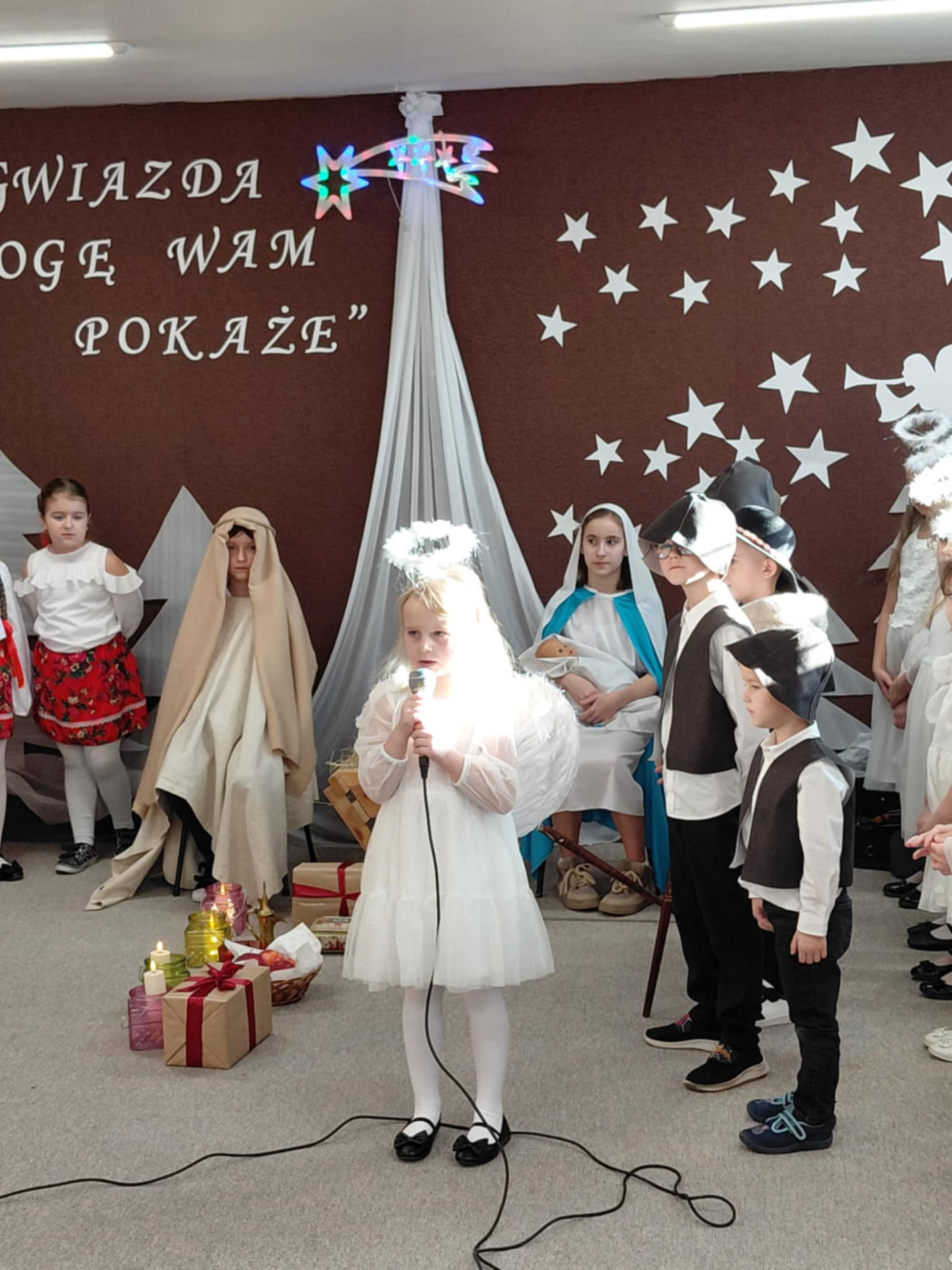 Najmłodsi uczestnicy z przedszkola zaprezentowali się w rolach aniołów i pasterzy, wzbudzając duże zainteresowanie i sympatię publiczności. Uczniowie klas II wcielili się w role dzieci wędrujących do żłóbka Jezusa, prezentując przygotowane dialogi oraz kolędy. Uczniowie klas VII i VIII pełnili funkcję narratorów oraz aktorów, dbając o spójność przekazu i właściwy przebieg przedstawienia.