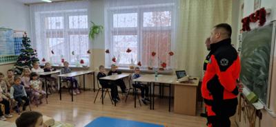Podczas spotkania strażacy opowiedzieli o swojej codziennej pracy, zagrożeniach pożarowych oraz zasadach prawidłowego zachowania się w sytuacjach niebezpiecznych. Uczestnicy dowiedzieli się, jak reagować w przypadku pożaru, wypadku czy innych zdarzeń wymagających wezwania pomocy. Szczegółowo omówiono również zasady bezpiecznej zabawy na śniegu i lodzie.